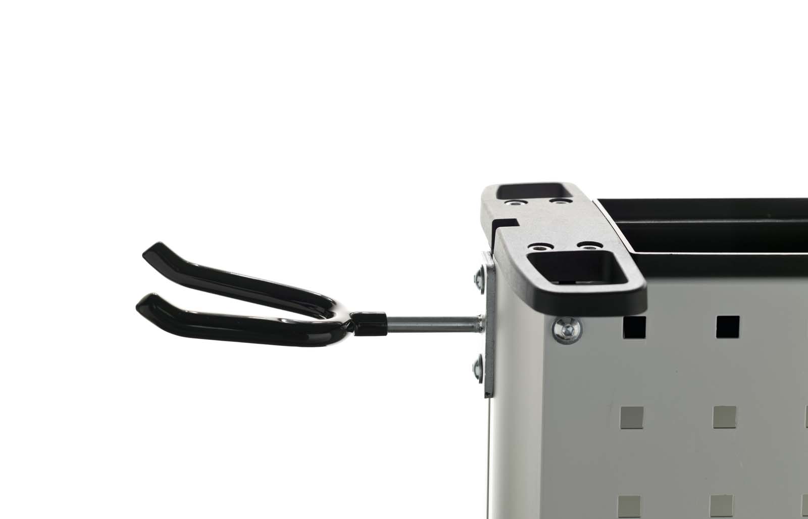 - Maksymalna elastyczność – hak do zawieszanie dwóch maszyn z wężami ssącymi, uchwyt uniwersalny, półka oraz obrotowa półeczka na drobne części