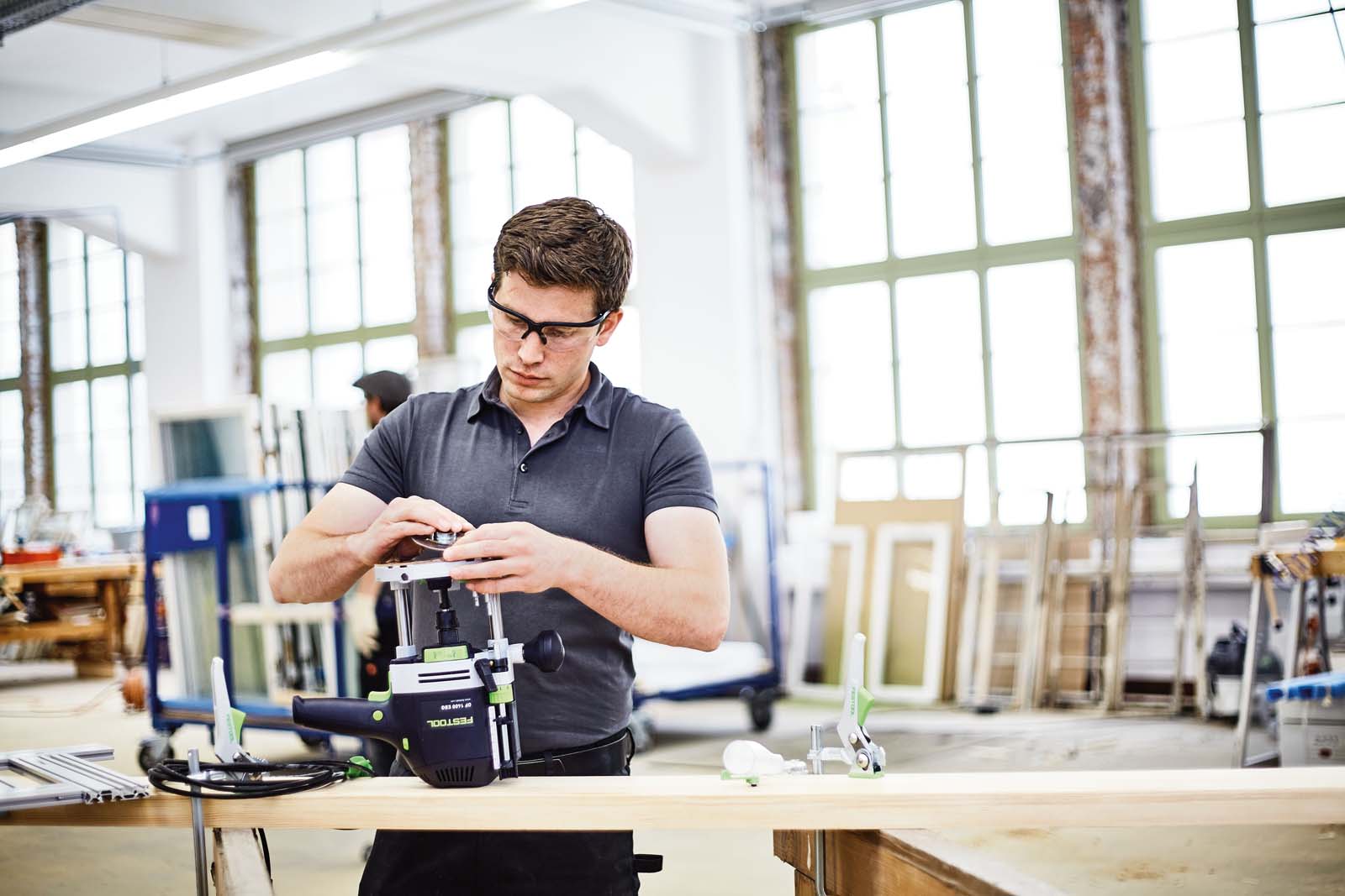 Zastosowanie: Zaokrąglanie krawędzi, fazowanie, wykonywanie wręgów i profilowanie|Wyfrezowywanie okręgów i wycięć przy użyciu wielofunkcyjnego szablonu|Wpusty w tylnych ściankach, wpuszczanie listew zapłetwionych – z syst. prowadzącym|Kanały w krawędziach drzwi na uszczelki – z pomocniczym szablonem|Frezowanie materiałów mineralnych (maks. średnica frezu Ø 45 mm)