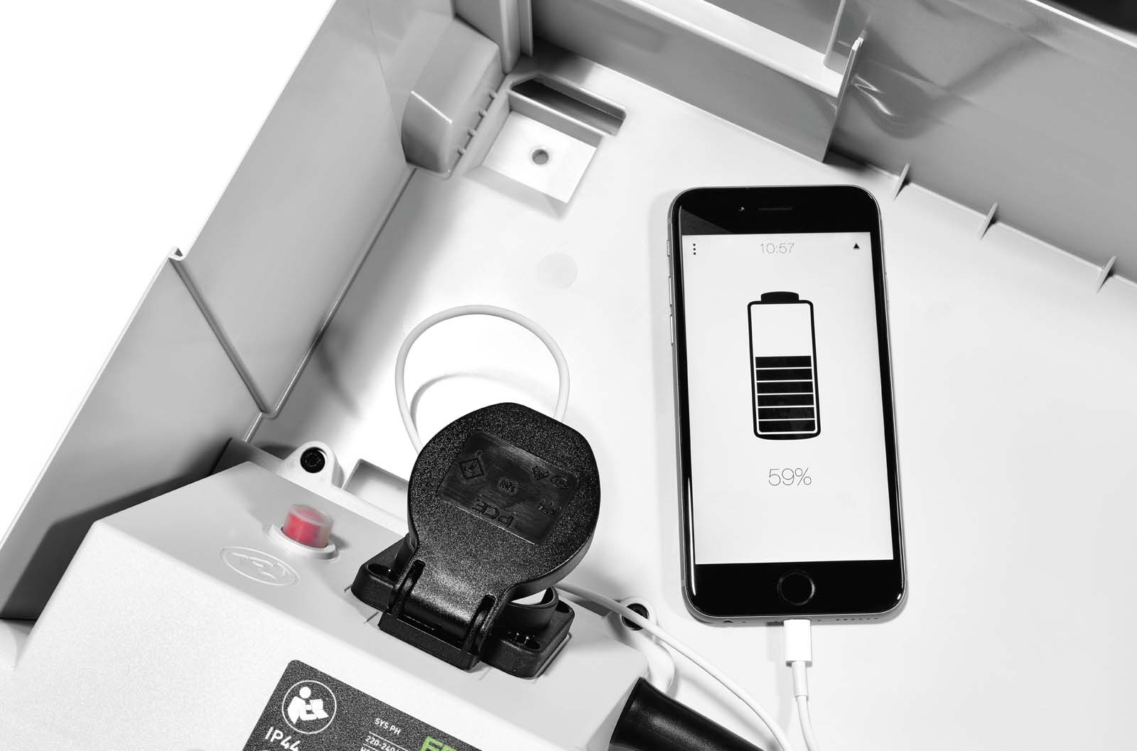 - Porządek: podłączony na stałe przewód przyłączeniowy o długości 10 m jest na czas transportu chowany wygodnie we wnętrzu. Ponadto SYS-PowerHub oferuje jeszcze miejsce na używane akumulatory oraz drobne części