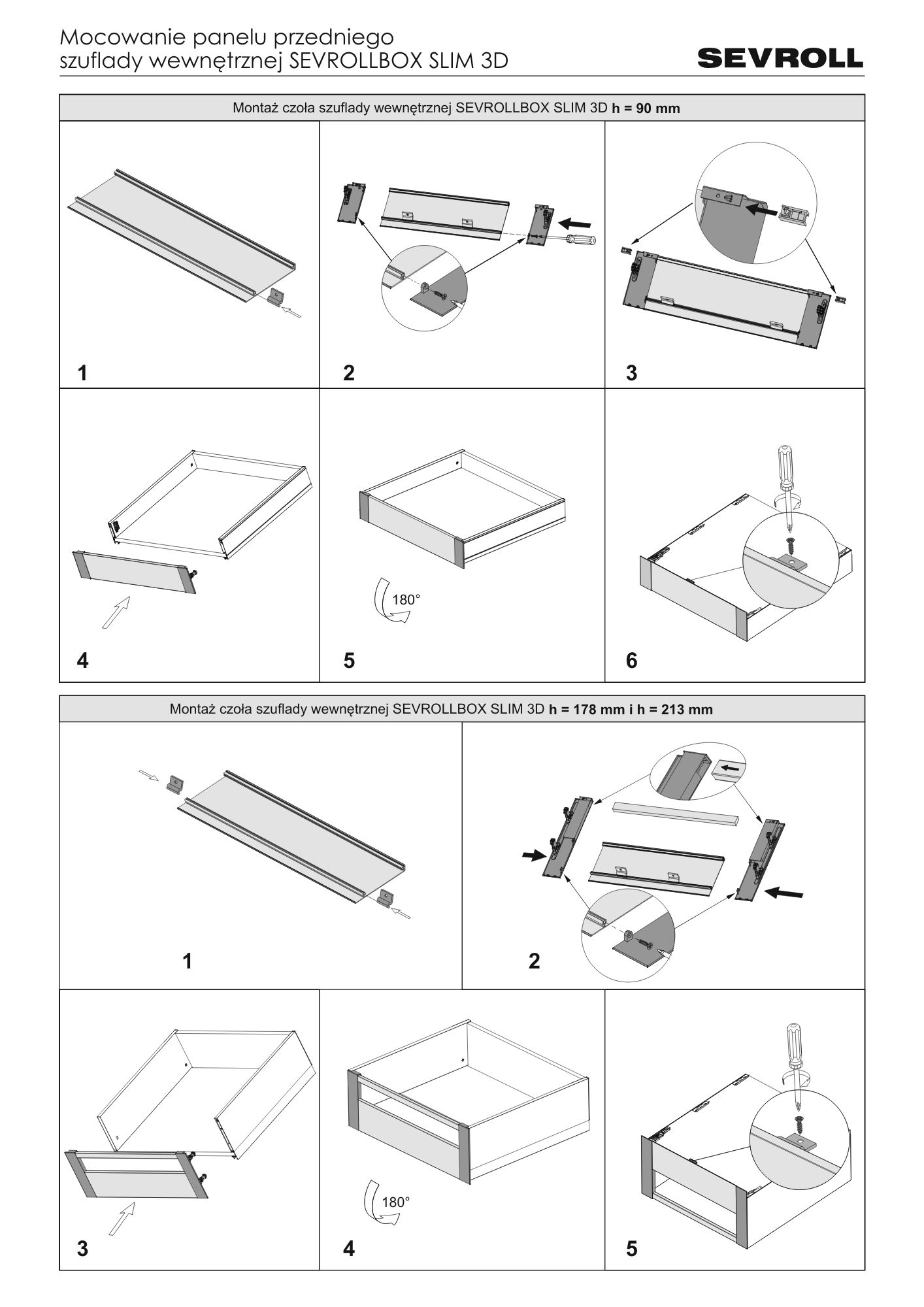 Mocowanie panelu przedniego szuflady wewnętrznej SEVROLLBOX SLIM 3D – elementy stosowane przy budowie szuflady wewnętrznej