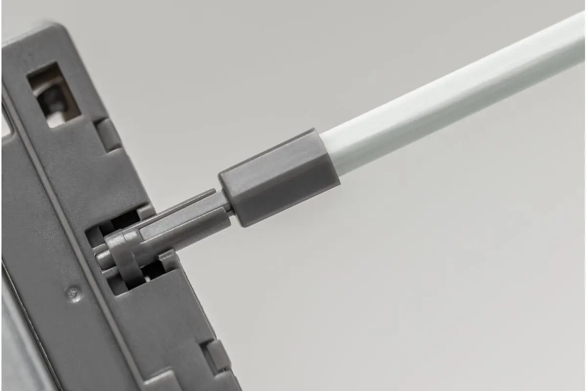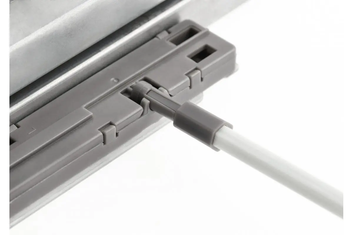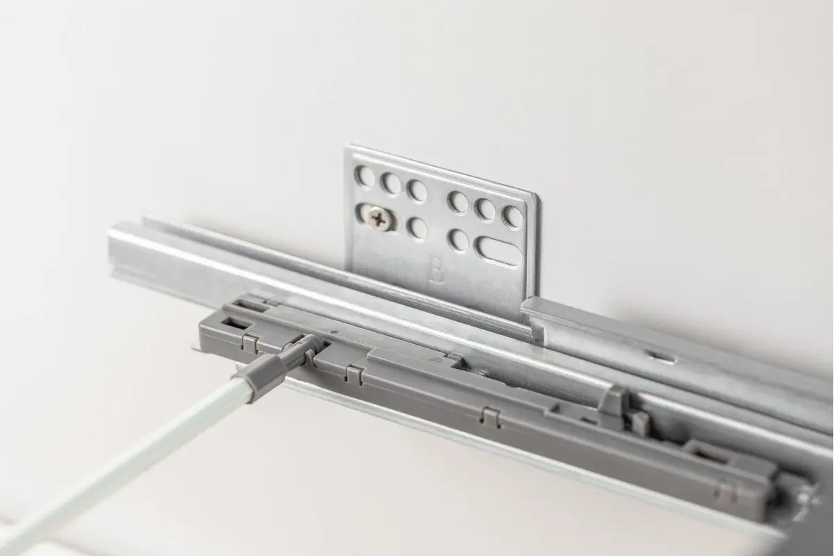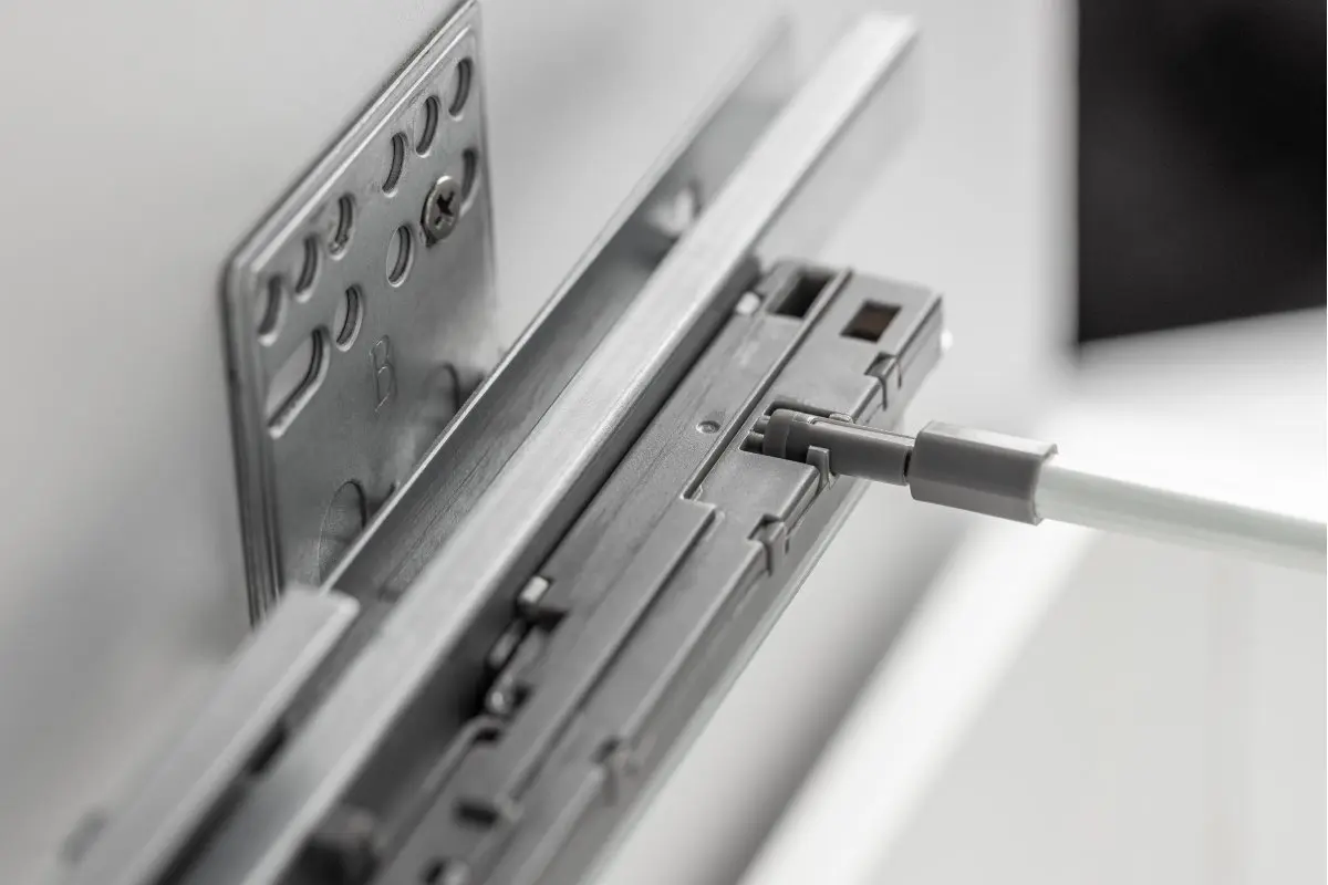 Poprzeczka synchronizująca do szuflady Axis Pro. Wykorzystanie synchronizacji w systemie Push-to-Open umożliwia jednoczesne wysunięcie obu prowadnic. Dotknięcie dowolnej części frontu powoduje zsynchronizowanie ruchu poziomego prowadnic. Poprzeczkę można przyciąć do wymaganej długości.