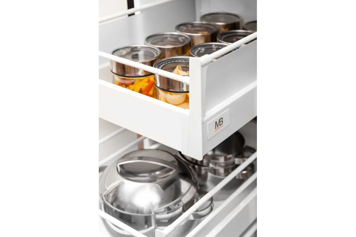 Reling wzdłużny do szuflad Modern Box, wykonany ze stali i dostępny w dwóch kolorach. Produkt poprawia funkcjonalność oraz stabilność szuflady.