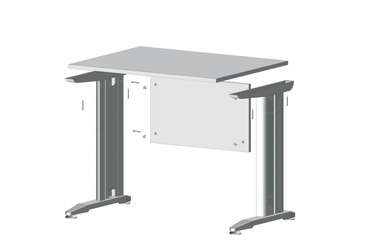Stelaż biurkowy służy jako konstrukcja nośna dla blatów. Ma wysokość 725 mm i głębokość 600 mm. Perforowany tunel kablowy łączy górną i dolną półkę, a w jego wnętrzu znajdują się 4 otwory do mocowania łączeń. Dolna półka wyposażona jest w regulowane stopki, które pozwalają na dostosowanie wysokości stelaża o 10 mm. Górna półka posiada dwa przeciwległe otwory o średnicy 7 mm, przeznaczone do montażu blatu roboczego. Regał wykonany jest ze stali, a jego powierzchnia jest pokryta srebrnym lakierem.