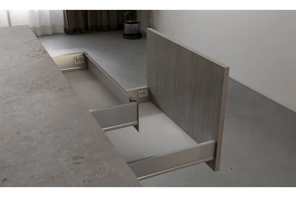 Nowoczesna szuflada Modern Box Pro została przetestowana na 60 000 cykli pracy i charakteryzuje się nośnością do 40 kg. Dzięki pełnemu wysuwowi (od 300 do 550 mm), zintegrowanemu mechanizmowi cichego domyku oraz synchronizacji prowadnic, korzystanie z niej jest wyjątkowo wygodne.
